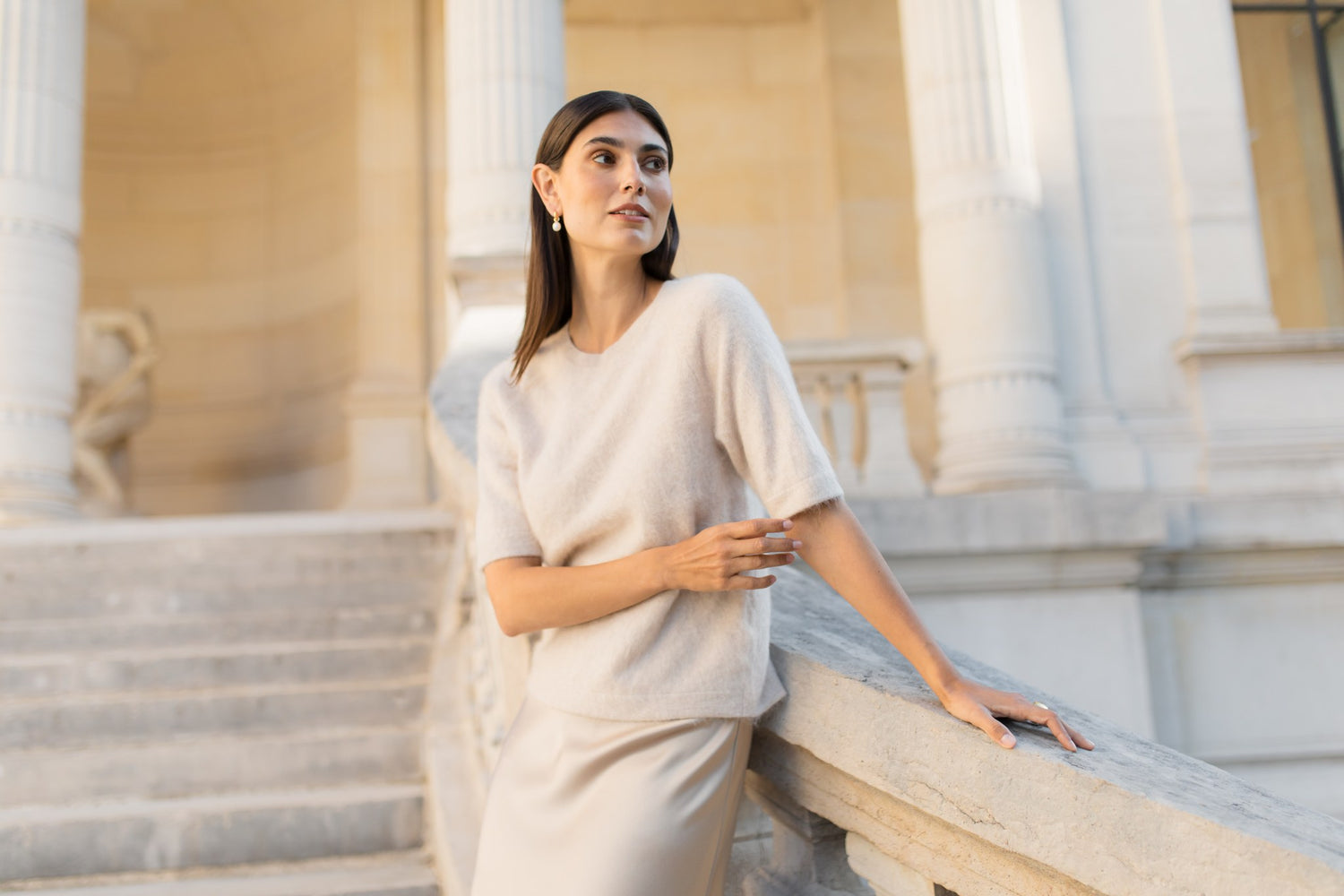 Carefully selected material ensures longevity. Alpaca wool does not pill easily, and its natural properties keep the knitwear upright. With good care, it will retain its softness and appearance year after year.