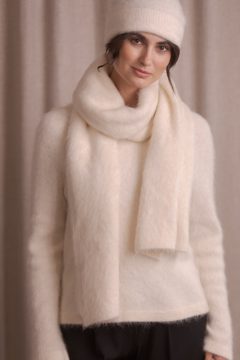 The plush and fluffy Alina alpaca scarf feels soft and warm against the skin. It is made from a high-quality alpaca blend and has narrow ribbed edges at the ends. The timeless colors will stylishly complement any outfit. Complete your outfit with a matching beanie or create a harmonious ensemble with different shades.