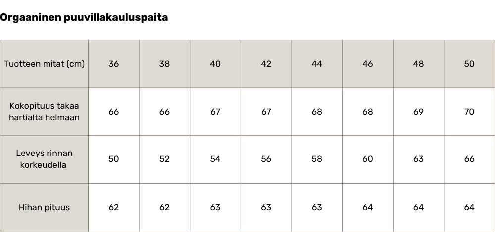 Size chart and fit