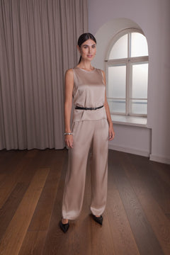 The waist has a hidden elastic band, which increases comfort and ensures a good fit. The trousers have no pockets, which makes the look simple and timeless. Tiana satin trousers are suitable for both more formal outfits and everyday use, and they are easy to combine with, for example, a triacetate shirt or a casual sweater. The model is available in the colors Latte, Black and Nougat.