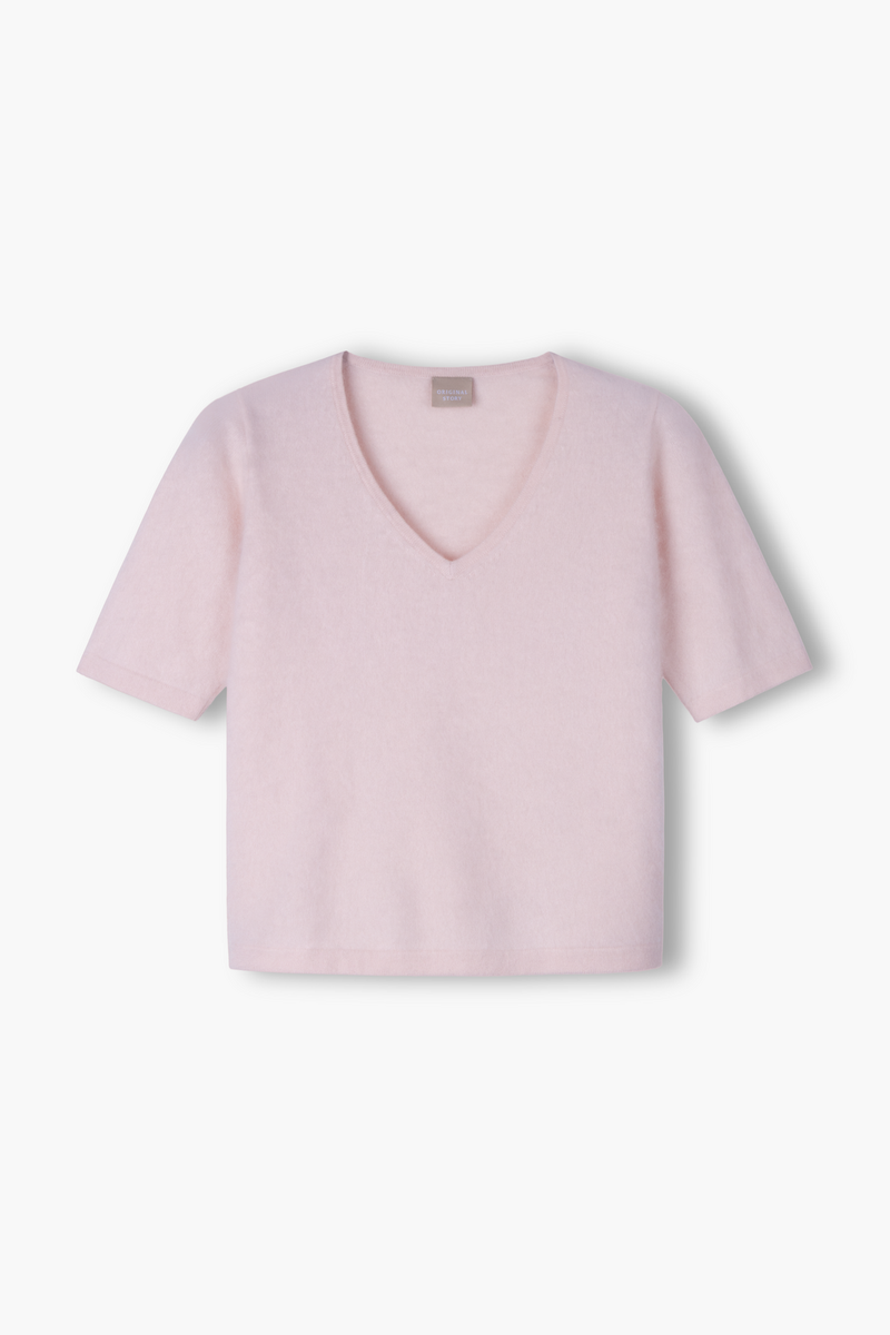 Lyhythihainen harjattu kashmirneule V-kaula-aukolla, Pale pink