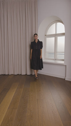 The short-sleeved design of the dress is combined with a fitted cut and carefully designed chest pleats that beautifully accentuate the body's curves. A discreet concealed button placket and turn-up cuffs give the dress a finished look. The two-piece hem falls slightly longer at the back, adding lightness and movement to the dress.