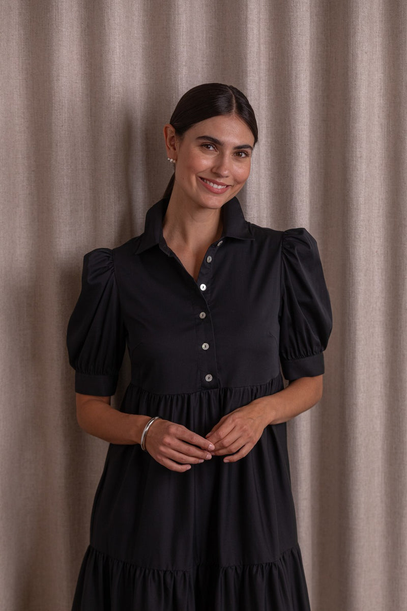 Short puff sleeve cotton blend dress, Black