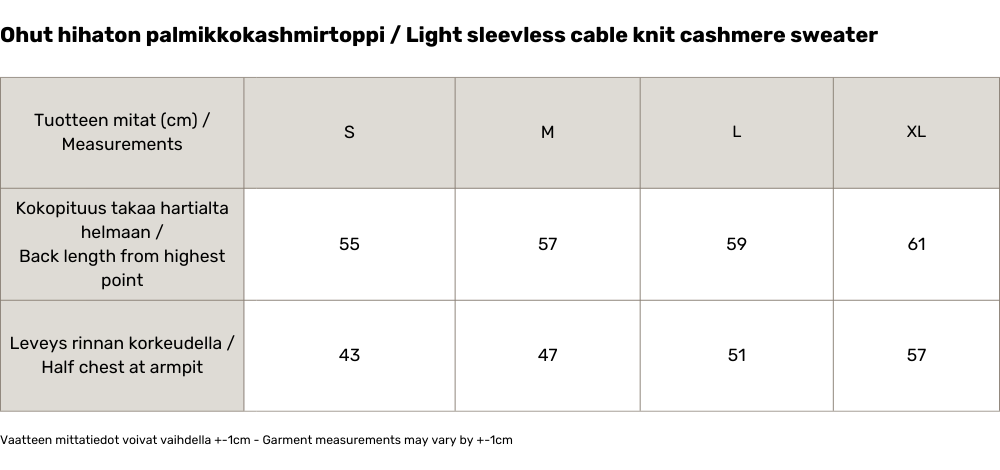 The slim, sleeveless Kamilia cashmere top combines lightness with classic elegance. The refined cashmere yarn makes the knit airy and soft against the skin, while the cable pattern gives the surface a timeless and textural look. The top works alone on warm days or when layered with a shirt, for example, and its lightweight silhouette makes it a versatile addition to any wardrobe.