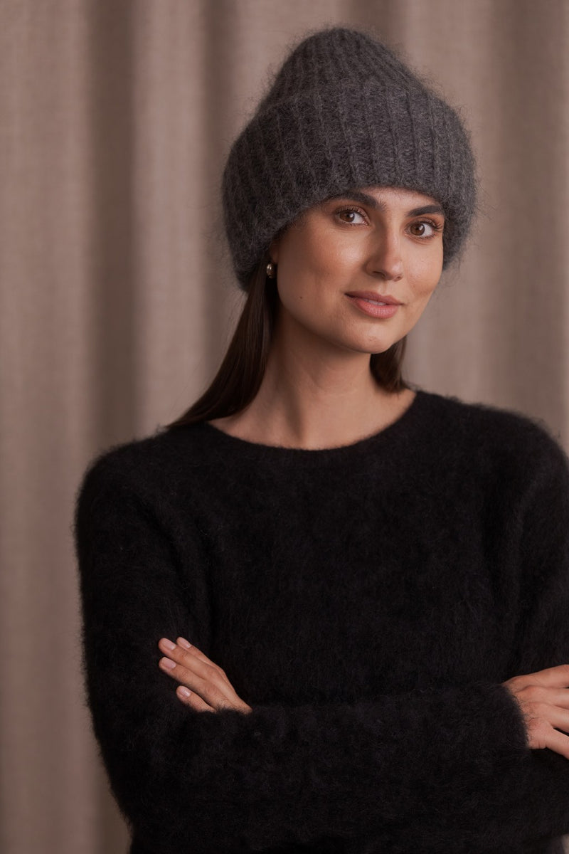 A stylish and chunky beanie knitted from Italian yarn effectively protects against cold weather. The beanie is made of a combination of soft kid mohair and warm wool, which makes the beanie soft and warm.