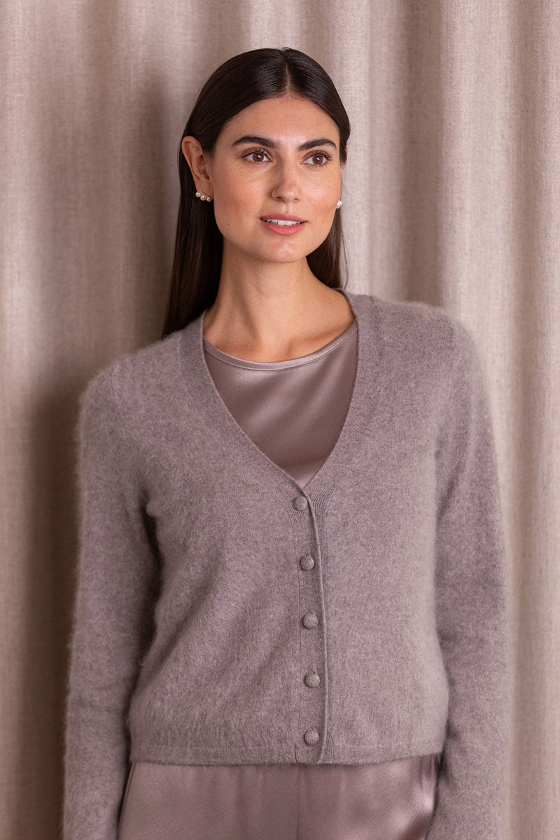 The long-sleeved women's cashmere cardigan has a wide V-neck, fitted sleeve lines and narrow knit turns at the cuffs and hem.