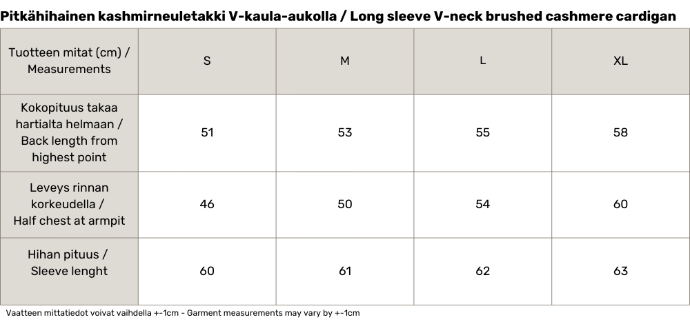 • Before you use the sweater, we recommend steaming it with a steamer or a steam iron to make the sweater soft and airy. After this, brush the sweater evenly with a clothes brush, which helps to keep the surface neat. Regular brushing and airing freshens the knitwear and reduces the need for washing. If washing is necessary, we recommend dry cleaning or gentle hand washing with a detergent suitable for natural fibers. Keep the sweater trimmed to keep it beautiful for a long time.